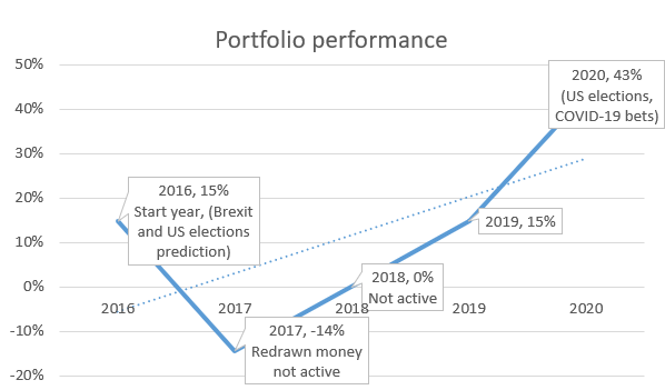 I started in 2016 just prior to the Brexit referendum which caused a lot of commotion in the markets. Many shares of companies that have dealings with Great Britain went down because of uncertainty and at almost the lowest point I bought my first shares. That same year was also an election year in the United States and I was convinced that Donald Trump would win. Here I predicted also correctly that first the share prices would go down a bit because the Democrats (which would have raised taxes) were on the winning side, however that Donald Trump would win and so share prices would go up again.